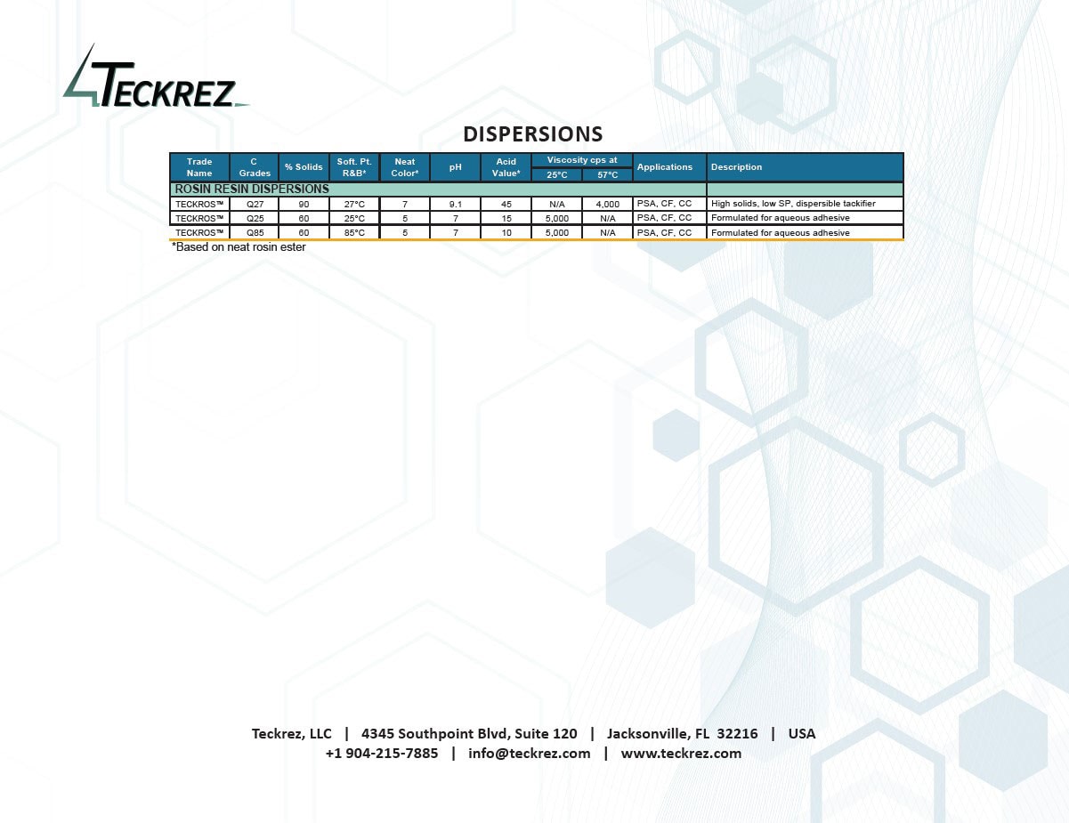 | TECKROS™ | Q27 | 90 | 27°C | 7 | 9.1 | 45 | N/A | 4,000 | PSA, CF, CC | High solids, low SP, dispersible tackifier |